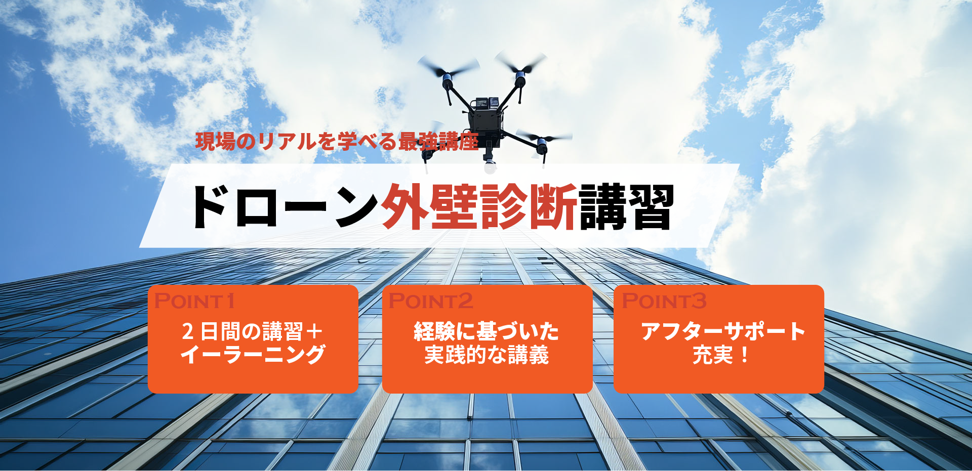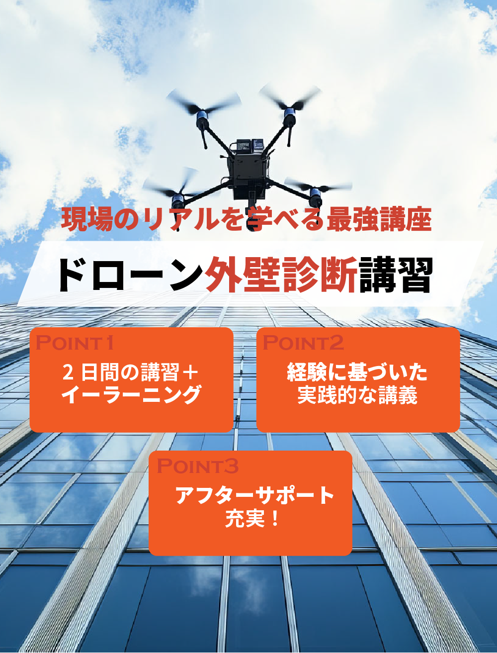 現場で発生した疑問は、いつでもご質問いただけます(質問し放題)。さらに、ご希望に応じて実際に現場に同行することも可能です 。安心してドローン外壁調査のプロとして活躍できるまで徹底的に支援します。